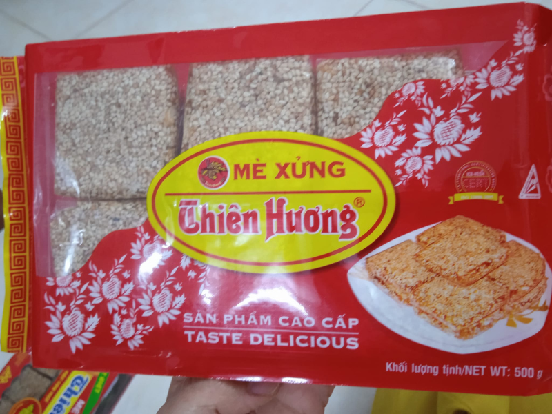 Mè Xững tại Huế thì loại nào cũng ngon cả, tuy nhiên thương hiệu uy tín, ngon nhất, nổi tiếng nhất Huế phải tìm đến Mè Xững Thiên Hương, phía dưới đây là bao bì nhãn hiệu “ Thiên Hương” bạn hãy để ý tránh nhầm lẫn nhé