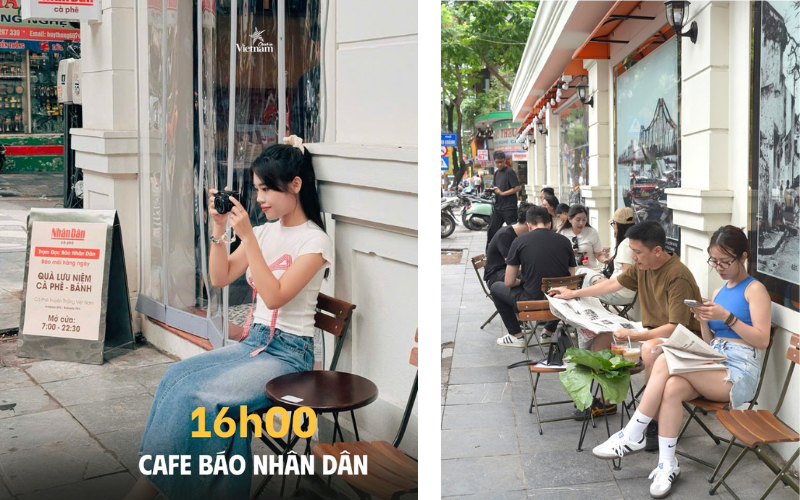 16h30 khi đã thấm mệt, chân cũng đã rã rời, bạn cần một chỗ ngồi thư giản, nhâm nhi một cốc coffe chuẩn gu Hà Nội mà lại có thể check-in thương hiệu Hà Nội. Du hí nào giới thiệu với bạn một quán không đụng hàng tại 71, Hàng Trống, Quận Hoàn Kiếm, Hà Nội, đúng như thương hiệu của nó, Coffe Nhâ Dân nằm ngay gần tòa soạn báo Nhân Dân, bạn có thể nhâm nhi một cốc coffe sữa đá, trên tay một tờ báo nhân dân, gợi lại cho bạn một thời vàng son của văn hóa đọc buổi sáng