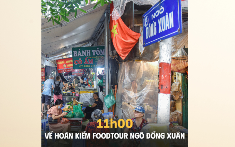 Khi đôi chân đã mỏi, trống bụng bắt đầu vang lên, lúc này bạn có thể di chuyển tới Ngõ Đồng Xuân để thỏa sức ăn những món ngon Hà Nội như bún ốc, phở, miến ngan… khung giờ 11h là lúc quán xá bắt đầu bán và cũng khá đông, nên bạn có thể tới sớm hơn.