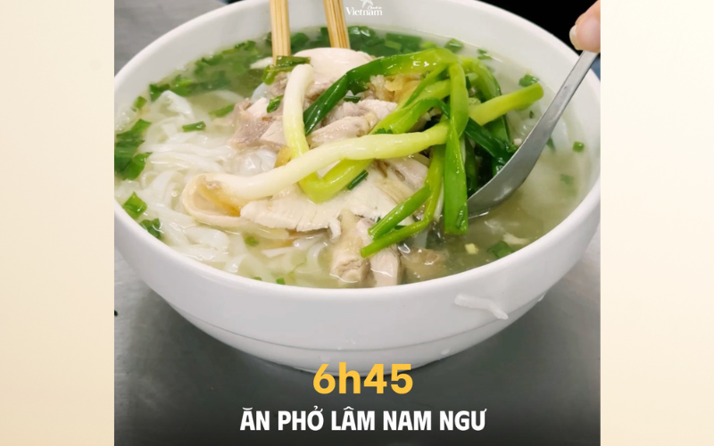 Di chuyển từ lăng chủ tịch tầm 6h25 phút, bạn có mặt tại Phở Gà Lâm tại số 7 Nam Ngư vào lúc 6h45 phút để thưởng thức tô phở gà đúng chất Hà Nội. Phở Lâm trước kia bị một tiktoker tố kỳ thị với người khuyết tật, nhiều người ăn thử thấy ngon, đậm đà, cô chủ quán vô cùng thân thương không như cõi mạng lan truyền.