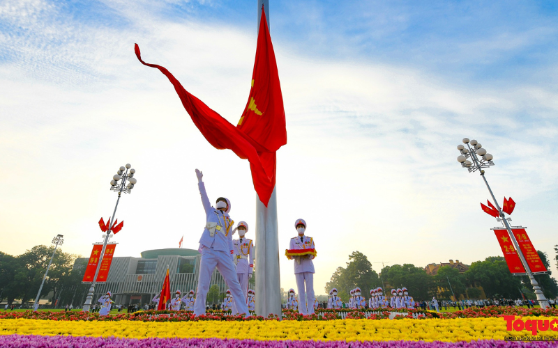 Nghi thức chào cờ Lăng Bác diễn ra tại Quảng Trường Bà Đình, ngay phía trước lăng Bác Hồ tại địa chỉ 02 Hùng Vương, Điện Biên, Ba Đình, Hà Nội