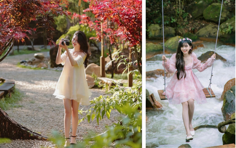 Vườn Địa Đàng điểm nhấn không thể bỏ qua với góc chill là thác nước 7 tầng, vừa mềm mại, vừa nhẹ nhàng, dịu dàng thướt tha như cô gái Đà Lạt đang vươn mình dưới thiên nhiên thơ mộng. Ngoài góc chill siêu hot này, quán còn sở hữu view với full option với đồi, núi, suối, rừng và hoa.